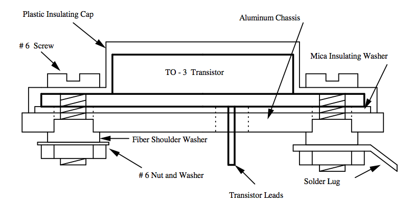 Back side of a power supply box with an MJ3001 Darlington transistor in a TO-3 package (right side).